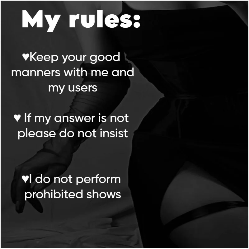Ahegao, Zezadu, Plácání po zadku, Erotický tanec, Velbloudí palec, Prstění, Striptýz, Footfetish, Twerk, Olejová show, Dildo nebo vibrátor, Kouření, Ponižování, Sexuální hračky, Hračky na bradavky, Kuřba, Masturbace, Orgasmus, Anál, Vaření, Zadkem k puse, Dvojitý průnik, Sprcha, Deepthroat, Anální hračky, Ženský výstřik, Hardcore